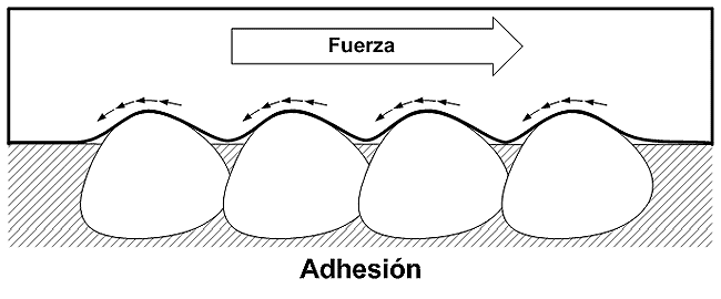 Por adhesión se denomina al fenómeno por el que los átomos de dos cuerpos en contacto, sean rígidos o no, desarrollan una pequeña fuerza electromagnética de atracción mutua. La resistencia a la ruptura de estas fuerzas provoca la aparición de otras paralelas a la superficie de contacto, que se opondrán a cualquier movimiento relativo entre los dos cuerpos.