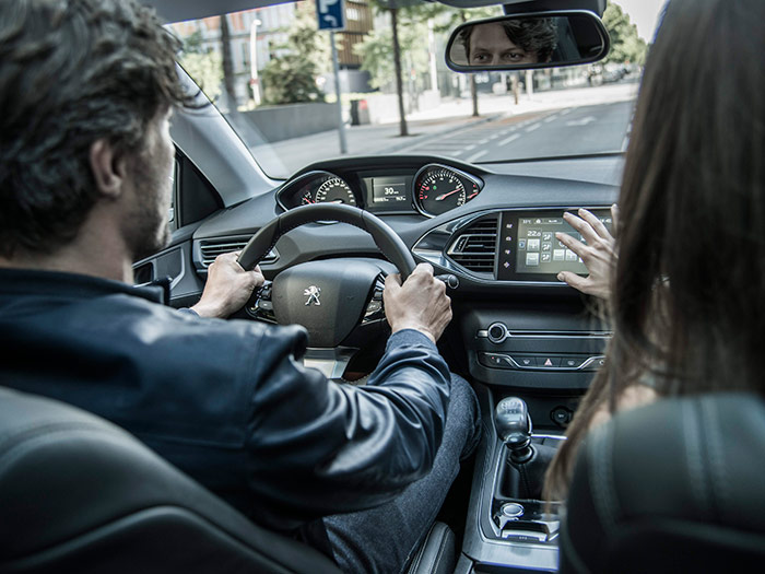 El puesto de conducción es moderno pero discreto, aunque introduce dos novedades: el cuadro de instrumentos se sitúa por encima del volante (como en el 208), y las agujas de los dos relojes principales giran en sentido opuesto, aumentando su lectura hacia el centro (una sensación rara al observar el cuentarrevoluciones).