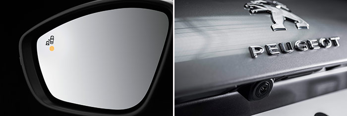 Dos detalles de las ayudas electrónicas a la conducción: el avisador de ángulo muerto incorporado en el retrovisor (junto con advertencia acústica), y la cámara de visión trasera para ayudar al aparcamiento.