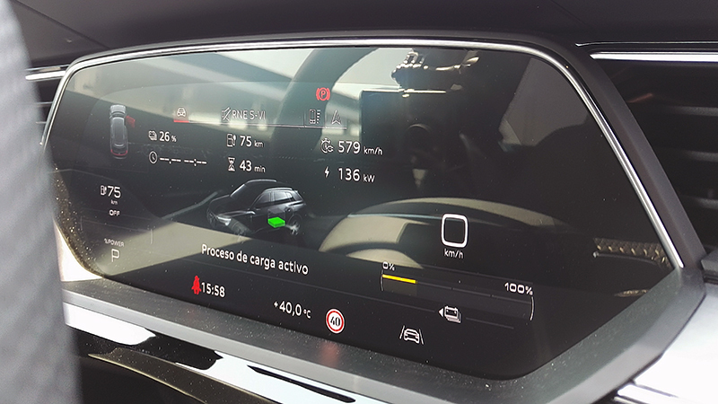A los puestos de 22 kW nos hemos conectado siempre con el cable Mennekes de 4,5 metros que trae el coche y nunca hemos tenido el problema anteriormente comentado de falta de longitud. En estos puestos la potencia de carga ha variado, según indicaba la instrumentación del vehículo, entre 9,7 y 10,0 kW. A esta potencia se recarga unos 40 kilómetros de autonomía por hora de conexión. Es un ritmo lento para un coche con una batería tan grande como la del e-tron 55 quattro. La carga más larga que hemos hecho en uno de estos puestos ha sido una del 80 a 100 %, que tomó dos horas.