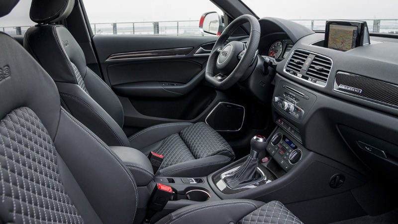 Forman parte del equipamiento de serie de las dos versiones los faros con tecnología LED, los asientos deportivos con el logotipo «RS Q3» bordado, el portón trasero de accionamiento eléctrico o las inserciones en fibra de carbono. En la pantalla del cuadro de instrumentos, además de un cronómetro para contabilizar tiempos en vueltas a un circuito, se muestra información de la temperatura del aceite y la presión de sobrealimentación.