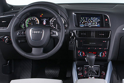 En el habitáculo apenas hay cambios respecto a cualquier otro Q5 (impresiones del interior de la gama Q5). Sí es distinto el maletero, que pierde el doble fondo al ir alojado ahí parte del sistema eléctrico (la batería de alta tensión y su sistema de refrigeración). Como consecuencia no puede llevar rueda de repuesto de ningún tipo. En el cuadro de instrumentos desaparece el cuentarrevoluciones y el indicador de temperatura del líquido refrigerante del motor. En su lugar hay un indicador que Audi llama «Power Meter», y un medidor de la carga de la batería, respectivamente (imagen). En la pantalla del navegador también se muestra información del sistema híbrido (imagen). En el apartado de Impresiones de conducción explicamos su funcionamiento.