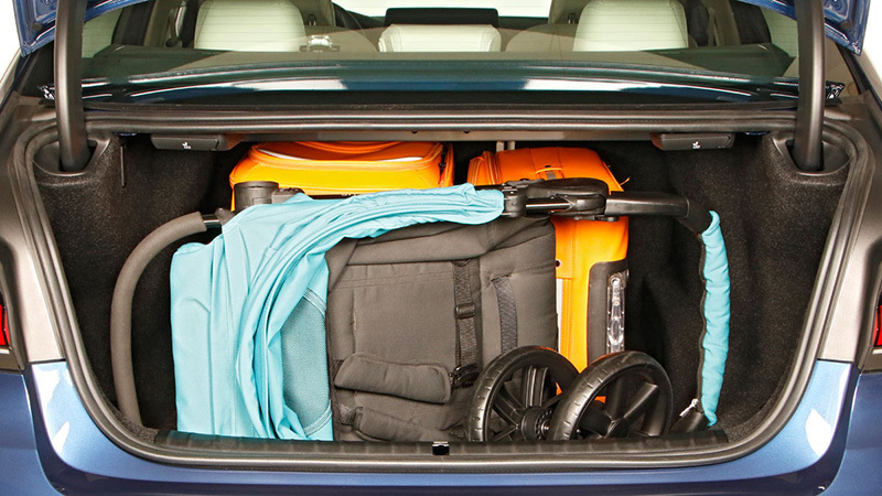 El maletero tiene un volumen de 530 litros, lo mismo que el del Audi A6. El del Jaguar XF y el Mercedes-Benz Clase E es más grande (540 litros), mientras que el del Volvo S90 es más pequeño (500 litros). Las paredes y el piso del espacio de carga no tienen unas formas tan regulares (imagen) como las de, por ejemplo, el A6 (imagen) y el Clase E, por lo que puede ocurrir que en función de lo que se transporte no se pueda aprovechar al máximo todo el volumen disponible. En el suelo hay cuatro argollas para colocar una red y en la pared izquierda un gancho para colgar una bolsa (imagen). En la pared derecha hay una toma de corriente de 12 voltios y en ambos laterales unos huecos de generoso tamaño, uno de ellos con tapa (imagen). Bajo el piso está la batería de 12 voltios, pero ningún hueco adicional.