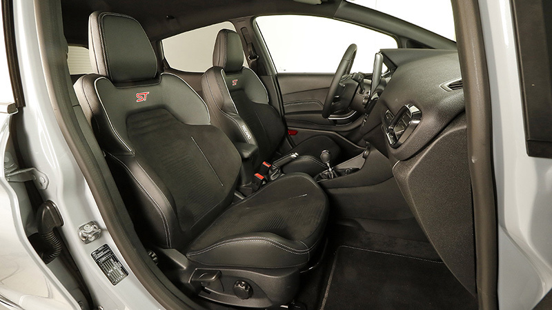 El volante es igual que el que tiene el Fiesta ST-Line, pero con un logotipo «ST» en la parte inferior (imagen). Otros puntos comunes entre el Fiesta ST y el Fiesta ST-Line son el pomo del cambio (imagen) y las inserciones decorativas de plástico imitando a fibra de carbono (imagen). El sistema multimedia es el SYNC 3, el cual se maneja a través de una pantalla táctil de 8 pulgadas (de serie, imagen) y tiene compatibilidad con Apple CarPlay y Android Auto. También son de serie un equipo de sonido de B&O PLAY y unos faros de ledes (imagen).