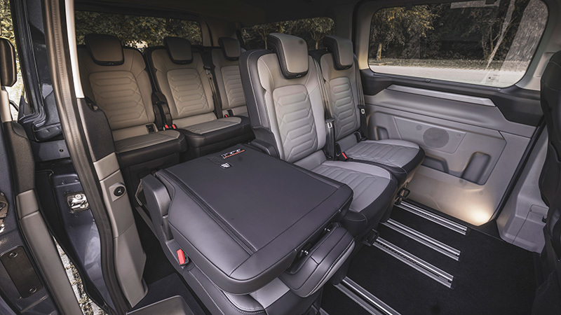 De serie hay una puerta lateral corredera y, en opción, hay otra en el lateral izquierdo de la carrocería (algunas versiones, además, incluyen apertura y cierre automatizados con función manos libres). En función del equipamiento, hay dos puertas posteriores de apertura lateral o un portón que se abre de abajo hacia arriba. El Ford Tourneo Custom de carrocería larga dispone de más sitio de almacenamiento detrás de la tercera fila de asientos (hay 632 litros frente a 514 en el caso de la carrocería corta).