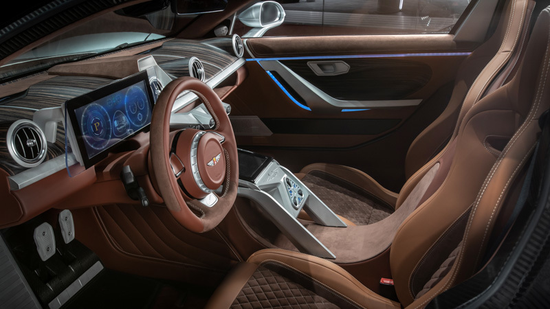 Las puertas se abren mediante un movimiento de tijera (se elevan y giran). El habitáculo está revestido de piel, Alcantara, madera, aluminio y fibra de carbono. Cada propietario puede personalizar el perfume interior. El sistema multimedia se controla desde una pantalla táctil de 10,1 pulgadas y desde los mandos del volante, dispone de CarPlay de Apple y de un equipo de sonido de seis altavoces más un altavoz de graves. A través de una aplicación para dispositivos móviles es posible conectar con el vehículo remotamente y configurar detalles como la climatización, las luces, la alarma o la carga de la batería.