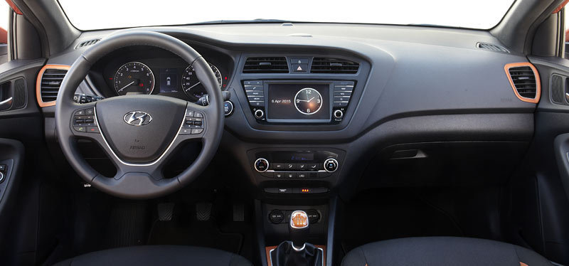 El i20 Coupe da la misma impresión de buena calidad que el i20 de cinco puertas. El buen ajuste entre piezas y solidez no siempre se encuentra en modelos europeos, como un Renault Clio. Lo que no tiene es un aspecto especialmente moderno, pero todo es sencillo, está bien ordenado y es fácil de utilizar. No hay una gran pantalla táctil en el centro del salpicadero sino una pequeña, no táctil, con botones a su alrededor y de manejo intuitivo.