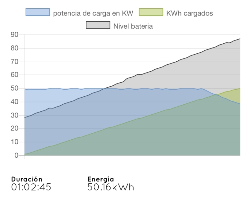 La gráfica de potencia de esta recarga muestra una respuesta muy estable, cercana a los 50 kW en todo momento. Prácticamente a partir del 75% de capacidad, la potencia comienza a descender hacia los 40 kW, repitiéndose el patrón obtenido con cargas a más potencia.