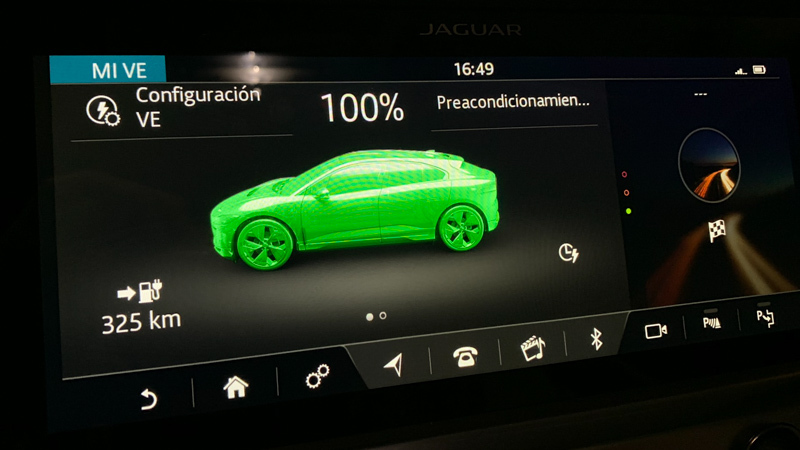 Durante la recarga, en la pantalla de la instrumentación aparece un gráfico del I-PACE «rellenándose» junto al porcentaje de llenado de la batería, el estado de la conexión, la autonomía prevista con ese nivel de carga y el tiempo estimado hasta completar el 100 %. Esta información puede verse replicada en la pantalla del sistema multimedia (y en el teléfono móvil), desde donde también se accede a los menús de configuración del vehículo eléctrico.
