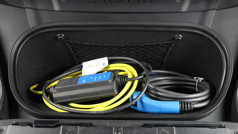 El cargador de abordo del I-PACE es monofásico de 7,2 kW. En el equipamiento de serie del coche vienen incluidos los siguientes elementos: un cargador doméstico para carga lenta con enchufe tipo «Schucko» —el mismo que tiene cualquier aparato de uso cotidiano—, que admite una intensidad de 10 amperios (es decir, a 230 V son 2,3 kW de potencia máxima) y otro para recarga semirapida, con un terminal Mennekes en un extremo y de Tipo 2 (IEC 62196-2) en el otro, que admite hasta 32 amperios, para recargas de hasta 7,2 kW y cuya toma de corriente a la pared requiere una instalación industrial y un contrato de potencia que normalmente no es tan elevado en un hogar.