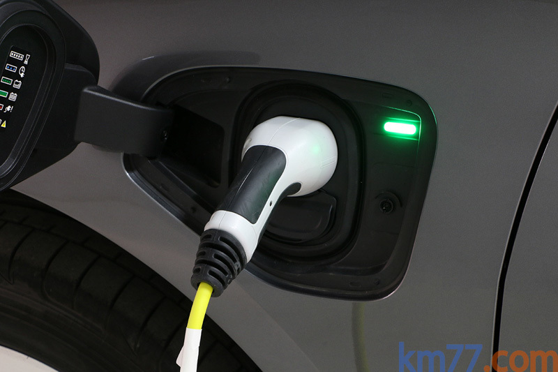 La toma está protegida por una portezuela que se abre lateralmente al hacer presión sobre ella. Un led en la esquina superior derecha tiene la misión de indicar en qué estado se ecuentra la fase de carga con luz intermitente o fija y una leyenda indicativa en un adhesivo (imagen). Su estado normal mientras carga debe ser verde (imagen), si bien nosotros solo lo hemos visto encendido durante las recargas con corriente alterna a través del cargador doméstico de 2,3 kW. Al hacer cargas rápidas con el conector CCS Combo, nunca hemos visto este piloto encendido (imagen).