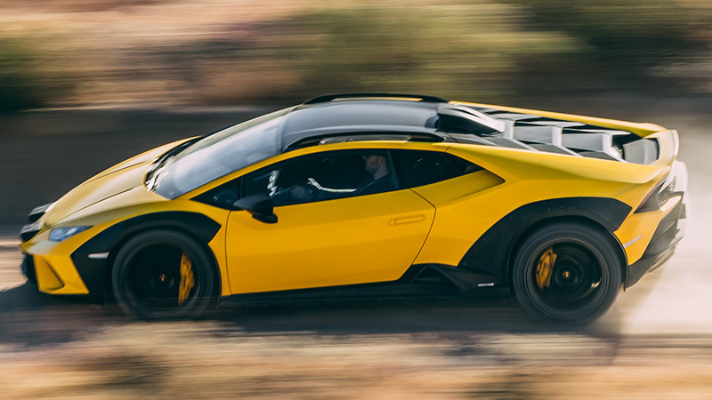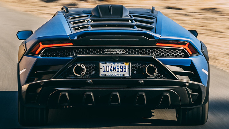 El Huracán Sterrato absorbe los malos caminos con pocos saltos y ruidos. Y no solamente hablo de irregularidades menores como las que había en abundancia en la carretera, sino también de lo que me encontré durante unas vueltas en el circuito Chuckwalla Valley Raceway, el trazado se había modificado para adentrarse en una zona mucho más exigente en donde incluso era fácil sentirse culpable al meter un automóvil cuyo coste ronda los 300 000 euros. Dicho trazado estaba compuesto por barro y arena húmeda, algunas piedras y abruptos saltos que, al abordarlos, sorprendía la forma en cómo la suspensión los absorbía, sin sacudidas violentas, sin sonidos que indicaran un maltrato al conjunto y sin golpes en la columna de la dirección, y que me hacía más fácil la tarea de corregir la trayectoria. El sistema de tracción integral prioriza —en los modos «Sport» y «Rally»— el reparto de potencia al eje trasero y produce con facilidad el sobreviraje que, dicho sea el paso, me ha parecido muy fácil de corregir con movimientos sutiles sobre el volante o con acciones muy suaves sobre el acelerador.
