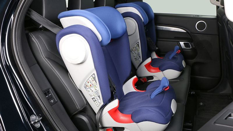En el interior del Discovery se pueden acomodar cuatro sillas infantiles ancladas con Isofix con facilidad. La altura de carrocería puede ser beneficiosa de cara a que no hay que agacharse, o un incordio para personas de baja estatura. En la segunda fila queda un espacio en medio para que un niño que no necesite un sistema de retención especial pueda viajar. En la tercera fila, caben dos sillas más con sus correspondientes ISOFIX (imagen).