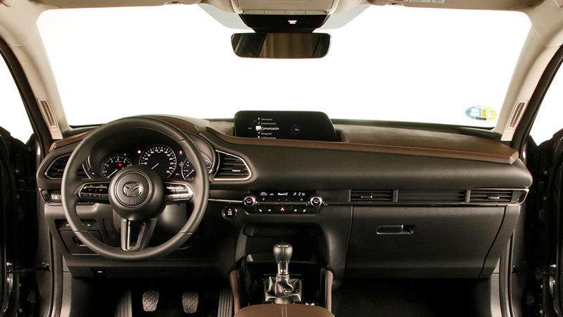 El aspecto del salpicadero es prácticamente idéntico al del Mazda3, con el que también comparte sistema multimedia —con pantalla de 10,25 pulgadas (8,8 hasta julio de 2023) de serie; imagen— e instrumentación (imagen). Los acabados y los materiales empleados para fabricar el habitáculo son buenos para lo que cuesta y las posibilidades de personalización, más amplias que las de cualquier otro modelo de Mazda (incluyen varias combinaciones de color para los asientos, el salpicadero o el guarnecido las puertas).