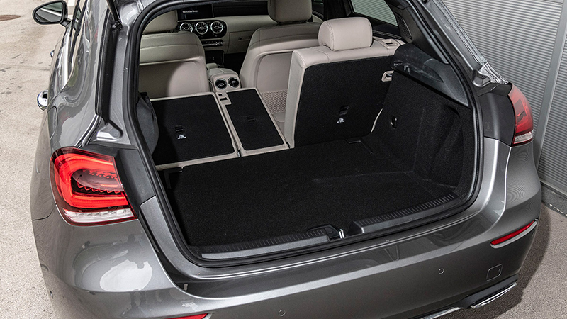 El volumen del maletero es de 370 litros y, según Mercedes-Benz, este no varía en función del tipo de suspensión trasera o del sistema de tracción. En comparación con sus alternativas, tiene diez litros menos que un Audi A3 Sportback, un SEAT León 5p 2020 y un Volkswagen Golf 5p (todos con 380 l), y diez litros más que un BMW Serie 1 5p y que un MINI Clubman (ambos con 360 l) —listado de alternativas ordenadas por volumen del maletero—. La boca de carga tiene 20 centímetros más de anchura (según Mercedes-Benz, esa distancia no la hemos medido en el modelo previo y no tenemos referencia). El piso del maletero se puede levantar y extraer. Bajo él hay un espacio ocupado por herramientas que no puede ser aprovechado para guardar objetos (imagen).