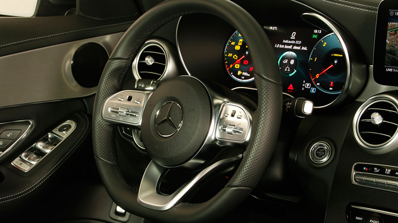 - Instrumentación: la de serie es una clásica con dos indicadores grandes de aguja (velocímetro y cuentarrevoluciones) y una pantalla en el centro, de 5,5 pulgadas con una resolución de 383 por 600 píxeles. Es la misma y la única que podía tener el Clase C 2014 (imagen). La novedad es que ahora la instrumentación clásica se puede reemplazar por una pantalla de 12,3 pulgadas con una resolución de 1920 por 720 píxeles (imagen). La ventaja con respecto a la de serie es que en la pantalla se visualizan más datos a la vez y que permite cambiar ligeramente el diseño de la representación gráfica (hay tres estilos: Deportivo, Clásico y Progresivo; se pueden ver los tres en esta imagen). Tiene un procesador que mueve las animaciones gráficas con mucha fluidez, la organización de la información es clara y la protección contra los reflejos es buena.