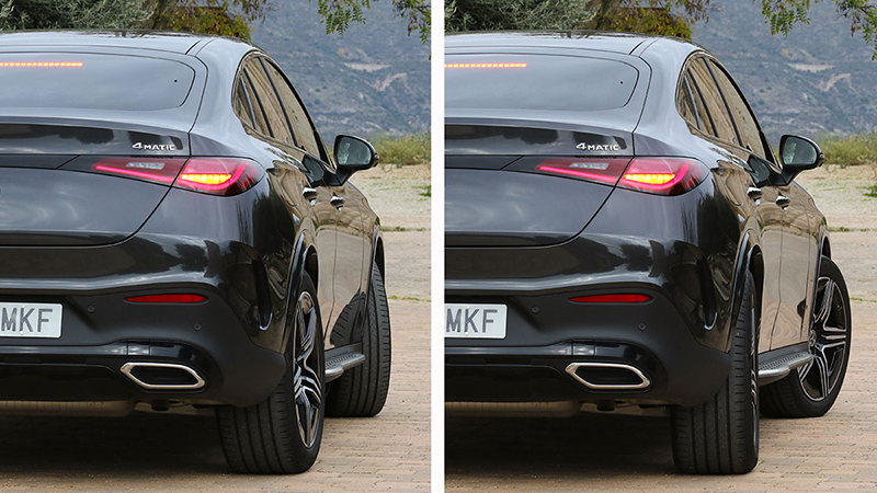 Aunque el GLC Coupé no es extremadamente largo (4,77 metros), su anchura sí es importante: 1,92 metros, la misma que un BMW X4 y dos centímetros más que un Audi Q5 Sportback. Con estas dimensiones, hacer maniobras en espacios reducidos no es sencillo. Por esta razón recomiendo mucho pagar por el eje trasero directriz comentado en el párrafo anterior. Gracias a él, el diámetro de giro se reduce 90 centímetros y pasa de 11,8 a 10,9 metros. De esta manera, el GLC Coupé necesita un metro menos que un Audi Q5 Sportback para dar media vuelta y 1,2 metros menos que un BMW X4. Esta buena capacidad de giro conviene completarla con el sistema de cámaras de 360 grados (de serie es solo la posterior), que tienen muy buena resolución y ayudan a apurar las distancias con las paredes, columnas y otros vehículos.