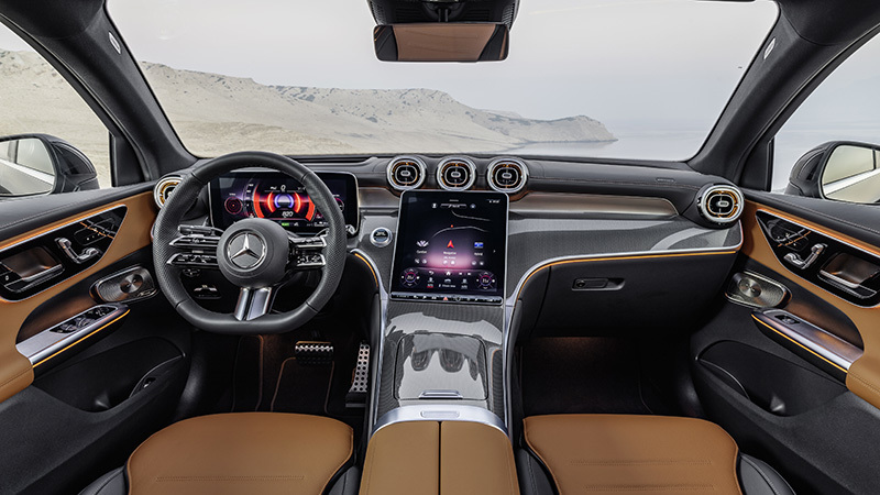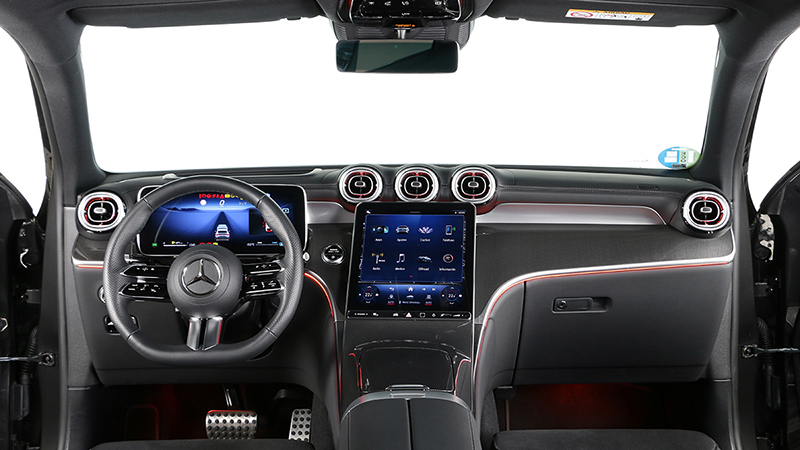 El salpicadero del GLC Coupé es el mismo del GLC. Dos pantallas lo protagonizan, una de 12,3 pulgadas para la instrumentación y otra de 11,9 para el sistema multimedia, esta última con formato vertical y ligeramente orientada hacia el conductor. Son pantallas de una excelente resolución gráfica y nitidez, que se manejan a través de una interfaz (MBUX) que exige un ligero esfuerzo de aprendizaje para navegar por los menús con soltura. Pero una vez se le coge el tranquillo, resulta fácil e intuitivo. La calidad de los materiales y los ajustes son buenos y el habitáculo transmite sensación de viajar en un coche de alta gama.