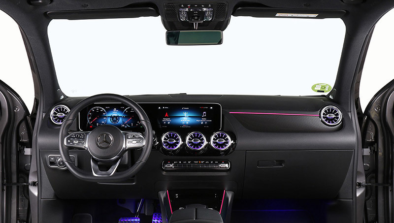El aspecto del salpicadero es muy similar al del Clase A. Como en este, la instrumentación se visualiza en una pantalla que va colocada detrás del volante, al lado de la del sistema multimedia. Hay tres configuraciones posibles para estas pantallas: pueden ser ambas de 7 pulgadas, la de la instrumentación de siete pulgadas y la del sistema multimedia de 10,25 o ambas de 10,25 pulgadas. Entre el equipo de serie está el sistema multimedia MBUX, que es destacable por las grandes posibilidades de personalización que ofrece y el avanzado sistema de reconocimento de voz que incluye (más información en este apartado de la información del Clase A).