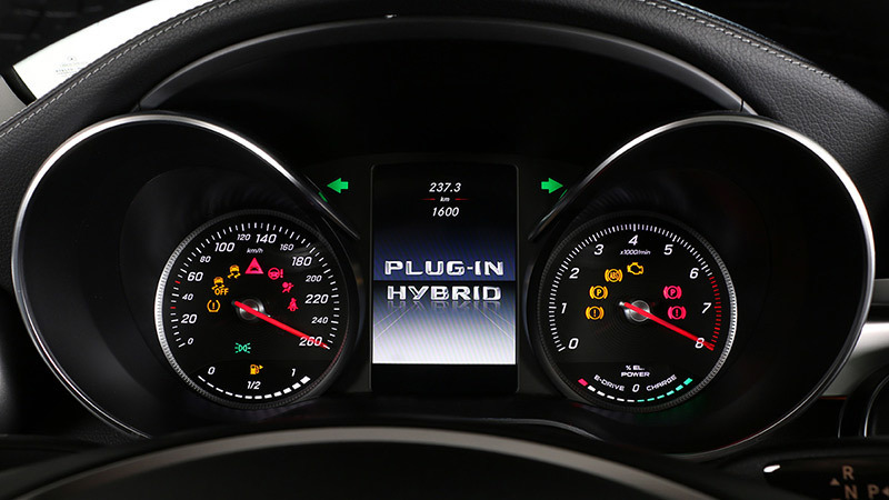 Como en cualquier otro GLC Coupé, esta versión híbrida ecnhufable tiene un interruptor en la consola —imagen, bajo él hay escrita la palabra DYNAMIC— con la que cambiar entre los cuatro modos de conducción disponibles: E (Economy), C (Confort), S (Sport) y S+ (Sport Plus). Con cada uno de ellos se modifica la respuesta del motor, la gestión del sistema híbrido, el funcionamiento de la transmisión y de la dirección y la potencia del sistema de climatización. Adicionalmente, hay cuatro programas de funcionamiento del sistema híbrido: HYBRID, E-MODE, E-SAVE y CHARGE (el cambio entre ellos se hace con el botón que hay debajo del que pone una «M» encerrada en un cuadrado; imagen).