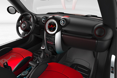 El interior tiene un diseño similar al del MINI Cabrio o el MINI Clubman. Las salidas laterales del sistema de climatización han sido sustituidas por unos altavoces porque, según MINI, su utilización sin capota hace que no sean necesarias. Hay una brújula a la izquierda de la columna de la dirección y un indicador de forma circular que informa sobre el grado de inclinación del coche tanto en el eje longitudinal como en el transversal. Este último está ubicado a la derecha del volante (imagen).