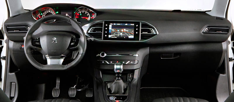 El interior de esta generación del Peugeot 308 presenta varias novedades de aspecto y también de carácter práctico. Una es que la instrumentación está diseñada para que se vea por encima del aro del volante. Esta configuración, según Peugeot, reduce la necesidad de desviar la vista de la carretera. Para que el volante no obstaculice la visión de la instrumentación, Peugeot usa uno achatado por su parte superior e inferior, y de menor diámetro de lo habitual. Este volante no tiene regulaciones amplias, especialmente en altura (solo se puede variar su posición tres centímetros). A pesar de todos estos condicionantes, ninguno de los miembros de km77.com que hemos conducido el Peugeot 308 hemos tenido dificultades para encontrar una posición cómoda al volante y que nos permitiese ver correctamente la instrumentación (más información en impresiones del interior).
