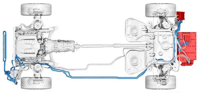 Hay tres circuitos de refrigeración en el coche. Uno para los dos motores. Otro, para el compresor y la electrónica de potencia. El tercero se encarga de refrigerar la batería si supera los 35 ºC, ya que no debe trabajar a más de 45 ºC. Si la temperatura es demasiado baja, una resistencia PTC se encarga de calentarla.