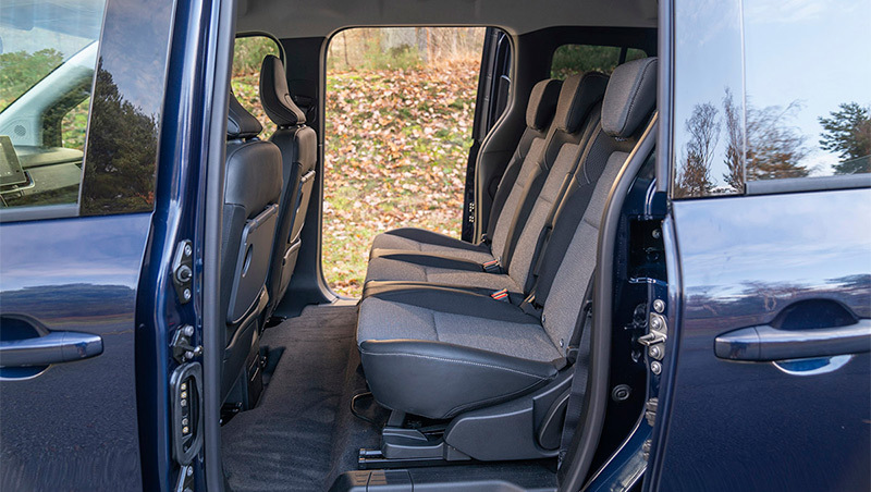 La batería, de iones de litio, está ubicada bajo el piso, pero no abarca toda la parte inferior. Ocupa la zona comprendida entre el final de los carriles de los asientos delanteros y hasta donde empieza el maletero. La posición de la batería tiene varios efectos en el interior del habitáculo. Uno de ellos es que ha obligado a Renault a colocar los asientos unos 3 centímetros más elevados que los del Kangoo Combi con motor de combustión (imagen). Aun con ello, los ocupantes llevan las piernas en una posición ligeramente elevada respecto al cuerpo, algo que también pasa en otros coches eléctricos en mayor o menor medida. Además, si los asientos delanteros van situados en su posición inferior, no queda sitio para que los ocupantes de las plazas posteriores metan los pies por debajo de ellos.