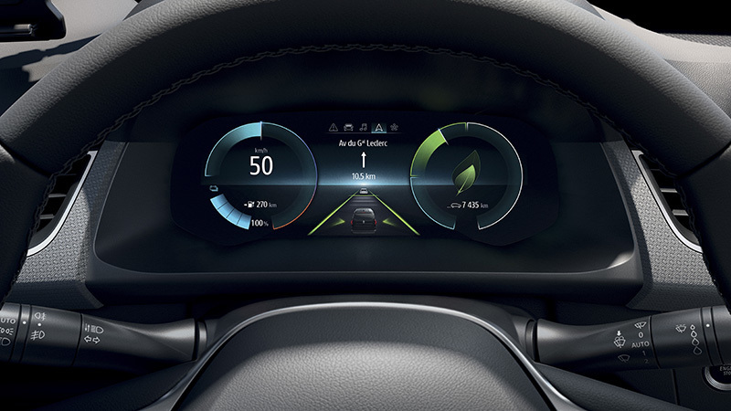 La instrumentación del Kangoo Combi E-TECH se ve en una pantalla de 10 pulgadas (imagen). Esto es algo, por el momento, exclusivo de esta versión eléctrica, pues los demás Kangoo tienen una instrumentación de tipo convencional (con dos grandes indicadores de aguja físicos y una pantalla central de 4 o 7 pulgadas; imagen). La pantalla del sistema multimedia es de 8 pulgadas y llega el software «Renault Easy Link» compatible con Android Auto y Apple CarPlay.