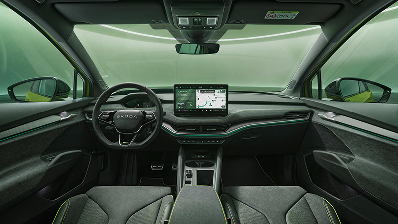 Los cambios de aspecto con respecto al Enyaq de la gama 2022 son los mismos que Škoda dio a conocer en la gama «convencional» hace unos meses: un frontal casi completamente renovado que se asemeja mucho al del Elroq (los faros, ahora unidos entre sí por una tira LED, se dividen en dos zonas: superior para iluminación diurna e intermitentes e inferior para iluminación principal) y una gama de colores y llantas distintas.