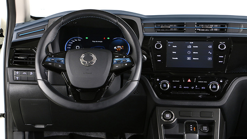 El interior del Korando e-Motion está pensado para ser práctico antes que vistoso. Todo lo importante queda a mano y se encuentra con facilidad. La posición al volante es buena y la visibilidad que tiene el conductor a su alrededor es correcta. La calidad de ajuste me parece reseñable, no porque los materiales sean lujosos, que no lo son, sino porque la mayor parte de las piezas que lo componen parecen sólidas y firmemente unidas entre sí. No hay ruidos al pasar por baches, ni al presionar moderadamente con los dedos los distintos componentes.