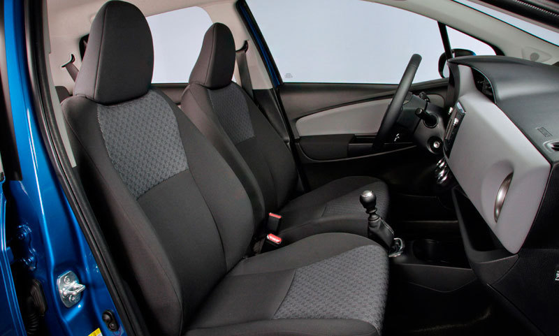 Toyota ha renovado parte de los plásticos que recubren el interior, concretamente los de la zona central del salpicadero, la consola y parte de los paneles de las puertas (imagen del salpicadero del Yaris 2011 e imagen del Yaris 2015). Además de esos cambios principalmente decorativos y de la ligera reubicación de algunos mandos, Toyota ha recortado 30 mm la palanca del cambio y ha elevado 3 mm la consola para mejorar el manejo del cambio. No hay variaciones en el número de huecos disponibles para dejar cosas.