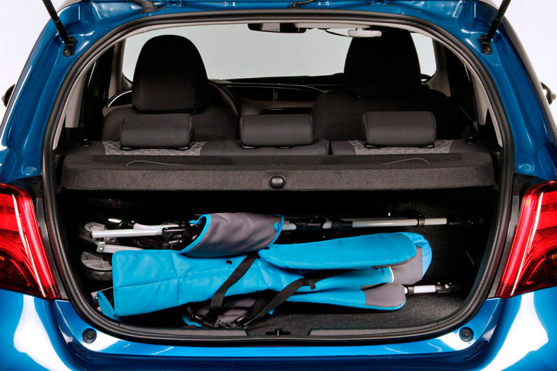 Como ya ocurría en el Yaris 2012, el asiento trasero no tiene regulación longitudinal (sí lo tenía el Yaris 2008 y anteriores). El volumen del maletero es 286 litros, no es de los más grandes si lo comparamos con el de sus rivales. El maletero puede llevar un doble fondo que se puede colocar a diferentes alturas (sirve, por ejemplo, para salvar el escalón que queda respecto al respaldo de los asientos posteriores cuando estos se abaten, imagen), y le faltan ganchos para colgar bolsas y argollas para asegurar objetos pesados.
