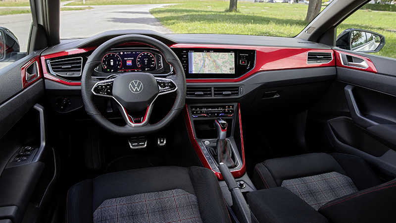 El interior también tiene un aspecto diferenciado. El volante, los asientos y la palanca selectora del cambio están acabadas con costuras rojas. Los asientos son específicos y van acabados en su parte central con una tapicería de cuadros, como es habitual en los modelos GTI de Volkswagen (también hay una tapicería opcional ArtVelours). Además, varias molduras del salpicadero, la consola y las puertas están pintadas de color rojo brillante denominado «Kings Red Glossy», aunque se puede pedir opcionalmente un color más discreto («Deep Iron Glossy»).