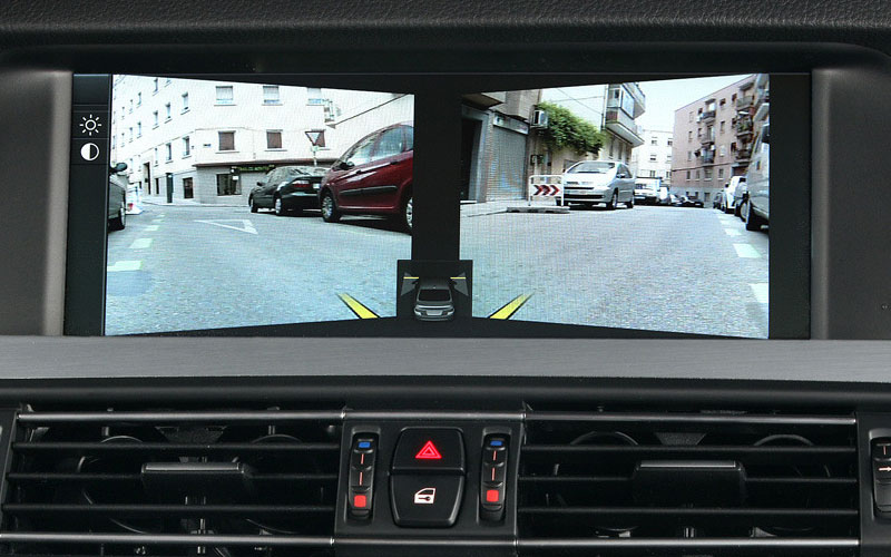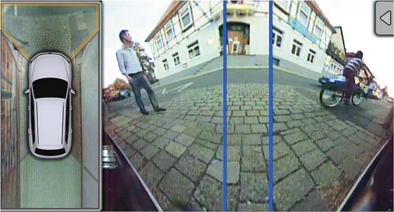 La fotografía siguiente muestra las imágenes que ofrece la opción «Surround View» de un BMW Serie 5 modelo del año 2011. En esta modalidad se muestran las imágenes procedentes de las dos cámaras instaladas en los laterales del parachoques, de forma que el conductor puede comprobar si hay tráfico en la calle a la que pretende acceder. Puede resultar muy útil en salidas angostas de garajes u otras circunstancias con visibilidad lateral reducida: