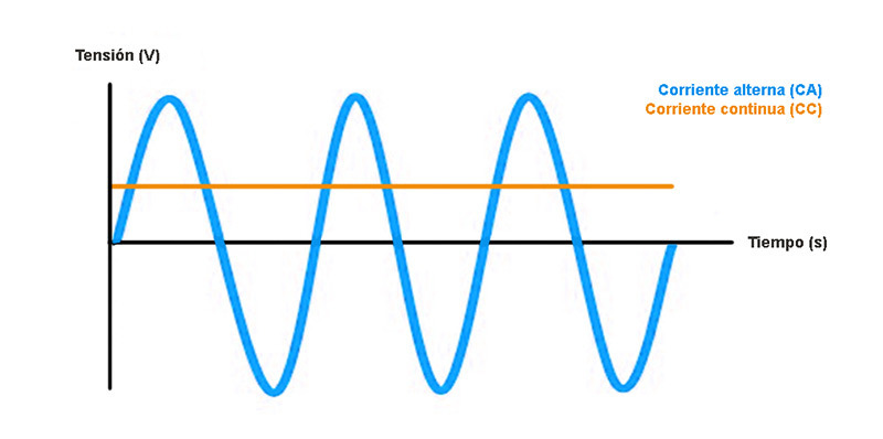 Corriente alterna: es aquella en la que el sentido del flujo varía cíclicamente. Se identifica como CA (o AC, Alternanting Current). Es el tipo de corriente que se suministra a los domicilios.