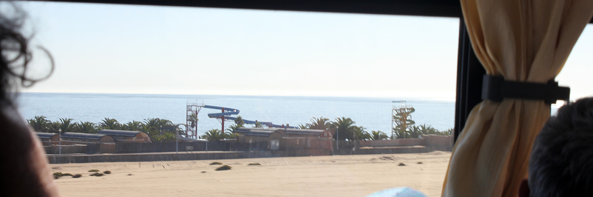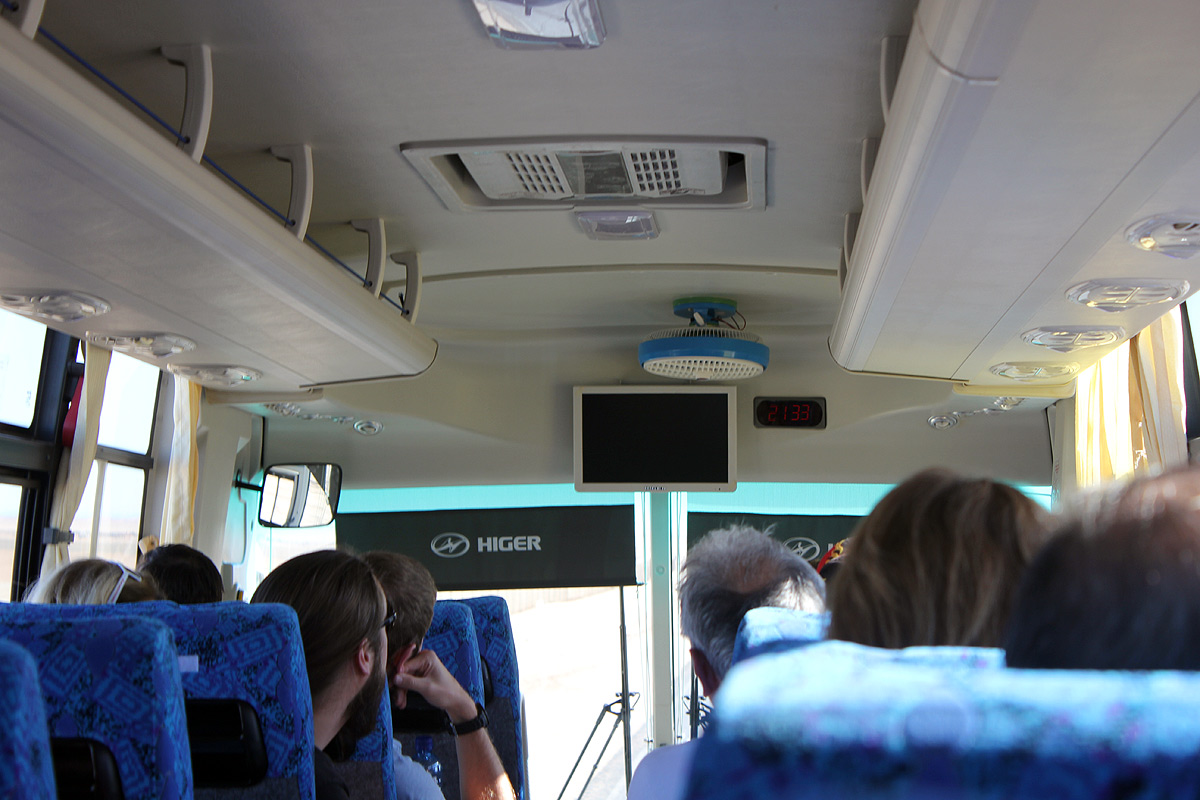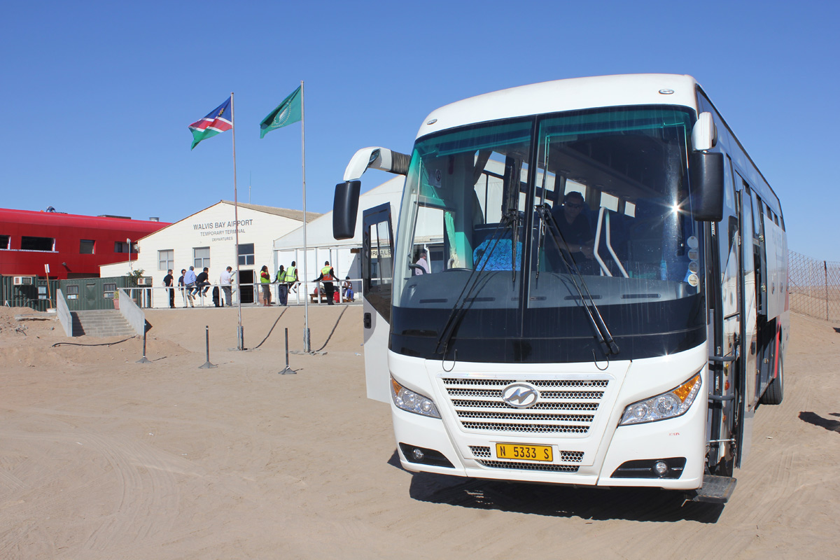 Llegamos al aeropuerto de Walvis Bay, que está en obras y en medio de la nada. Una carpa hace las veces de terminal. El autobús parece un Hyundai, pero es un Higer, marca china.