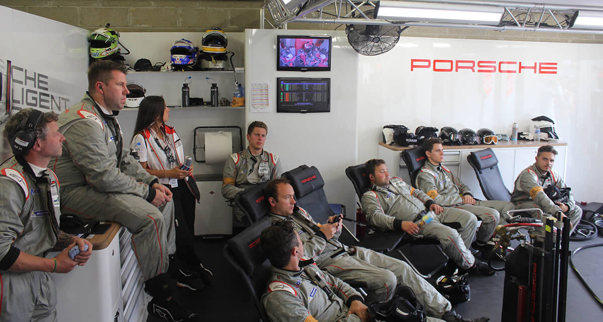 Charlando con Roberto descubrimos que él y los otros ingenieros que Porsche ha trasladado a Le Mans hacen un turno continuo, sin descanso, durante toda la carrera, más las horas previas y las posteriores. Trabajan en una sala organizada en varias filas de mesas repleta de pantallas con datos, en la parte trasera del garaje, sin comunicación directa visual con la zona de los mecánicos (en esta zona nos prohibieron hacer fotos).