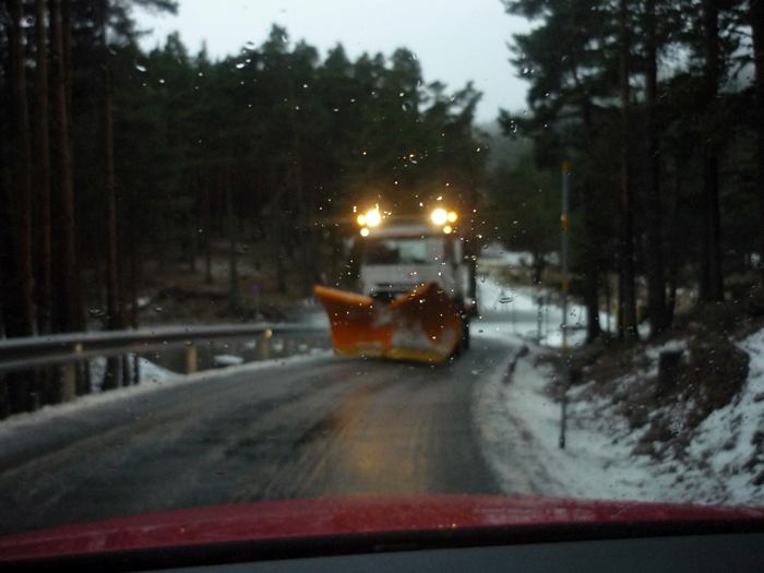 Mientras el quitanieves da marcha atrás me acuerdo del alce que apareció del bosque en Noruega. Recuerdo cómo salió disparado por donde venía, como si hubiera visto al diablo rojo. Recuerdo que el ABS fue mágico en aquel momento. El quitanieves, en cambio, ni se ha inmutado. Cuando paso por su lado de nuevo, después de apartarse, le hago otra foto, en primer plano. El aparato da miedo, pero el conductor fue muy amable sin mediar palabra. (Gracias por apartarse)
