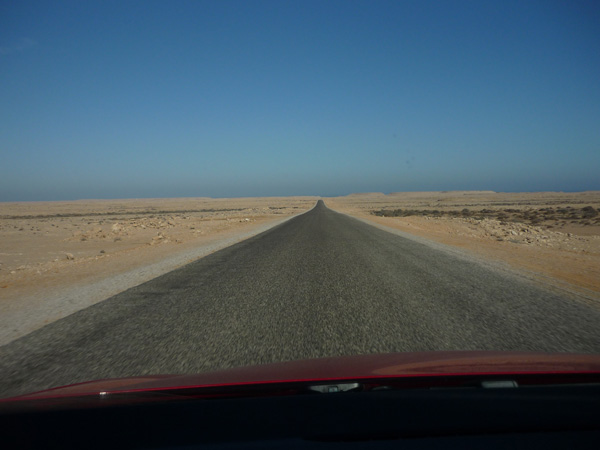 Tanto decir en cada control de policía que voy a Dakhla me confunde. Cerca ya del trópico, en el último cruce, el más fácil de todos, en el mismo control de policía, cojo a la derecha. Hacia Dakhla, que está en una península pequeña que se termina antes de llegar al trópico. Me doy cuenta cuando veo la península desde la carretera. Suerte que me he equivocado. El paisaje es terrible. La tierra árida invita a seguir, a descubrirla, pero doy la vuelta. Aprovecho para hacer fotos.