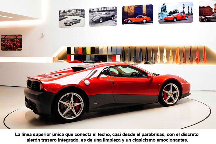 La línea, sobre todo delante, es más suave que en el 512 BB, en particular con una toma de aire que tiene mucho del diseño de la actual gama Ferrari. La parrilla, eso sí, está cortada en bisel inverso, en boca de tiburón, y aparece la salida de aire con láminas grises (tres en vez de cinco) en la zona central/delantera del capó, salida que en el 458 no existe. Las tomas de aire traseras han sido reposicionadas más arriba que en el original, mientras que las aletas no son tan ampulosas como en el 458. Finalmente, por encima de la luneta aparece el mismo esbozo de alerón negro que tenía el 512, otro detalle que en el Italia no existe, mientras que toda la zona inferior está en color negro, como en el 512.
