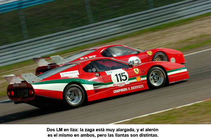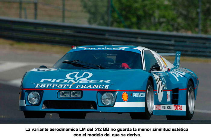 Del 512 BB se derivó una versión especial de competición, denominada 512 BB LM (Le Mans), con aerodinámica frontal y posterior radicalmente modificada y estudiada en el túnel de viento de Pininfarina; la realizó el departamento Assistenza Clienti a petición del equipo NART (North American Racing Team) de Luigi Chinetti; un hombre al que Ferrari le debe mucho, pues durante décadas fue su punta de lanza en USA. Sin duda la velocidad punta del LM sería mayor (quizás los 302 km/ de la ficha, a 7.000 rpm del motor), pero la estética quedó totalmente desfigurada. Curiosamente, ha sido más fácil encontrar fotos de este modelo de competición que del de serie, cuya foto reservamos para ponerla más abajo, y compararla con las correspondiente del 458 Italia y del SP-12 EC.