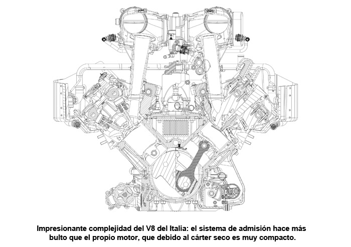 Y ahora sí que vale la pena mirar arriba y abajo, y comparar algunos datos de las respectivas fichas, para verificar los cambios tecnológicos ocurridos en el último tercio de siglo. En cuanto al motor, cuya sección figura debajo de este párrafo, vemos que las cotas mantienen una proporción similar (supercuadradas), pero son más grandes en el 458, al tener sólo ocho cilindros; pese a lo cual, sube 2.000 rpm más arriba. A ello colaboran, al margen de la calidad de materiales y lubricantes, el paso de dos a cuatro válvulas por cilindro, los variadores de distribución, la inyección directa (y no como la del 512i), y el notable incremento de la compresión, que pasa de un humilde 9,2:1 a un importante 12,5:1. El resultado de todo ello es subir de 72 a 127 CV/litro de rendimiento, y sin duda alguna con mayor elasticidad en bajo y medio régimen.