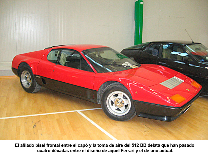 Y nos queda por ver lo que constituye el meollo de todo este asunto: las carrocerías. Así que empezaremos por echarle una mirada, aunque la foto no sea demasiado buena, al 512 BB original, ese cuyas tres unidades consecutivas hicieron que Clapton desease seguir conduciendo un coche con la misma estética, pero puesto al día. Y aquí está el coche, con sus llantas Cromodora, sin retrovisor derecho (no era obligatorio) y siguiendo la moda de los faros retráctiles; su línea sigue el diseño iniciado con el 308, utiliza la pintura en doble tonalidad, con la zona inferior en negro, y lleva unas tomas de aire NACA en dicha zona, por delante del tren posterior. Es un diseño muy perfilado, con líneas un tanto angulosas.