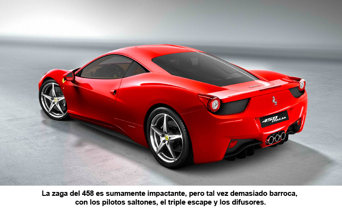 Y ahora pasemos a la zona posterior, observando que en el 458 la luneta es muy grande e inclinada, como en un coupé clásico, y los pilotos resultan muy saltones, un poco como los ojos de un batracio; todo el diseño posterior es un tanto barroco, con la triple salida de escape y una especie de difusor a cada lado. Esta es la correspondiente toma: