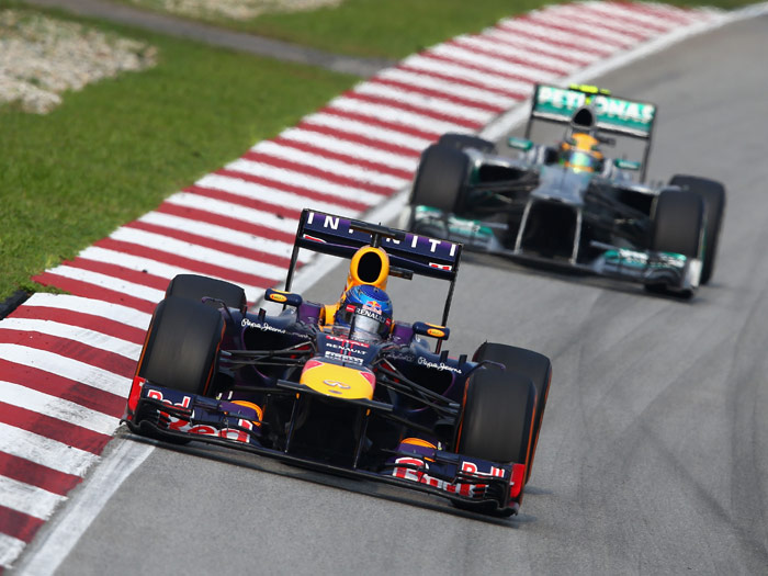 Si ya se vió lo que le pasó a Alonso, por un roce de nada con la zaga del coche de Vettel, es ridículo que te ocurra lo mismo con tu propio compañero. La verdad es que Webber, un tipo en principio muy majo, que habla claro pero que es un poco más lento y menos fiable que Vettel, y que con razón se siente tratado como nº2 aunque de boquilla lo nieguen, ha hecho siempre todo lo posible por fastidiar al del “dedo tieso” en cuanto ha tenido ocasión y sin el menor sentido de equipo, como se demostró en Silverstone en 2011 y en la última carrera en Brasil el año pasado. ¿No dicen que no hay órdenes?; pues yo a lo mío, hasta el último cambio de ruedas. Pero en Malasia ya se había hecho dicho cambio y además había órdenes expresas dadas por radio; y entonces Vettel se las pasa por el arco de triunfo y Webber se indigna como una doncella violada. Esta es la consecuencia de mantener posturas ambiguas, tanto respecto a dejar claro a quien se considera nº1 y nº2, como a las órdenes y a dejar claro si priman las prioridades de los pilotos o los intereses de la escudería; intereses que incluyen conseguir el Campeonato de Pilotos para uno de los suyos, lo que a su vez incluye una estrategia para favorecerle en la tabla de puntos, aunque sea al precio de sacrificar un puesto en carrera al piloto nº2.
