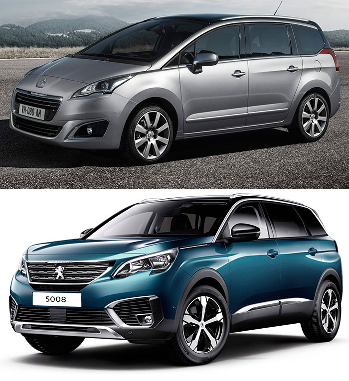 El suave frontal del anterior 5008 de segmento MPV, con capó en declive, es la única diferencia apreciable respecto al frontal más alto con capó casi plano del nuevo 5008 SUV. Por lo demás, perfectamente intercambiables en cuanto a tamaño, diseño y capacidad interior.
