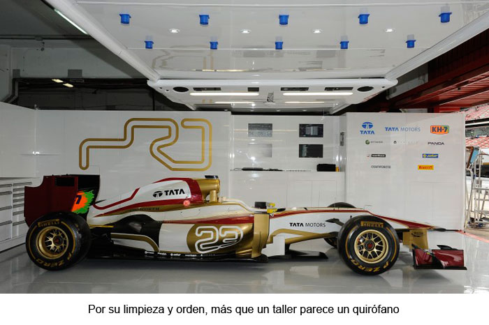 Mientras todo esto se aclara, si es que llega a aclararse, el caso es que ya tenemos una escudería propia y afincada aquí; una escudería de la que en la propia HRT dicen que quieren ser para nosotros como Ferrari para los italianos, guardando las distancias en cuanto a tradición y capacidad técnica. La intención es buena, y los principios parecen estar asentados en bases sólidas, por lo que vimos en la Caja Mágica; y por otro lado, ya tenemos un elemento muy interesante en común con Ferrari: ambas escuderías comparten, como patrocinadora, a Tata Motors, la firma india que controla a Jaguar y Land-Rover. Firma que, a su vez, forma parte del poderoso Grupo Tata, un gigante que emplea a 425.000 personas en numerosos países del mundo, y que aparte de Tata Motors, tiene empresas en los campos de la siderurgia, ingeniería civil, energía, química, informática, comunicaciones, alimentación, hostelería y asesoramiento jurídico. No es mal socio, como puede verse.
