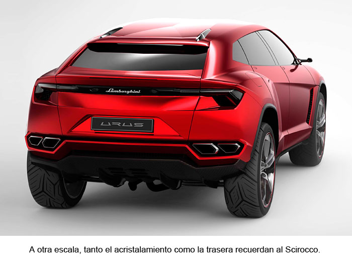 Es evidente que el Urus hereda del LM-002 no sólo la tracción total y el motor delantero longitudinal V-12 (en este caso con al menos 600 CV) sino también el tamaño: mide 4,99 metros de longitud y no debe andar muy lejos de los dos metros de anchura, si no los supera. Lo que sí se ha comunicado es que la altura es de sólo 1,66 metros, ciertamente discreta para semejante tamaño. Claro que dispone de una suspensión regulable, que sobre mal terreno incrementará en unos cuantos (o bastantes) centímetros la distancia libre al suelo. Lo que también está claro es que el nombre viene del extinto uro o auroch, el primitivo toro salvaje de la Europa central (a no confundir con el actual bisonte europeo), que en Lamborghini quieren considerar como antecesor, a su vez, del toro bravo español, del cual han tomado la mayoría de sus nombres. Teniendo en cuenta que los fósiles de auroch indican una alzada del orden de 1,80 metros a la cruz, nuestros actuales toros bravos parece que encogieron un poco de tamaño a lo largo de los últimos siglos, de ser cierta la ascendencia.