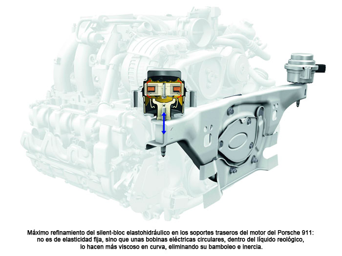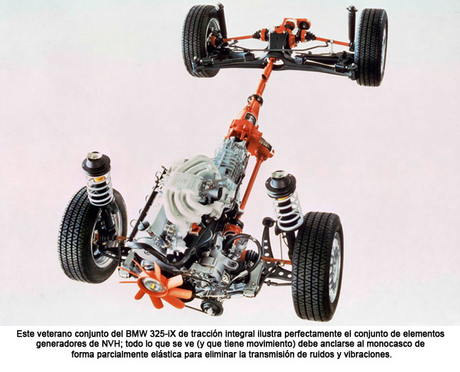 Pero el núcleo duro de los fenómenos que se entienden como NVH está constituido por la aerodinámica, la rodadura, y los provenientes de la mecánica, bien sean del motor o de la transmisión. Respecto al motor, y al margen del sonido del escape, tenemos el problema del control de par del motor, para que no transmita al monocasco traqueteos a bajo régimen, y vibraciones a uno más alto; los apoyos de tipo elastohidráulico han obrado maravillas al respecto. En cuanto a sonoridad mecánica, la única solución es el aislamiento del vano motor o el encapsulado, todavía más ceñido y exclusivamente del motor. Respecto a la aerodinámica, es una ciencia independiente, con parámetros absolutamente propios: aquí, todo lo que sea rebajar la sonoridad es bien recibido; pero sobre todo hay que anular los silbidos ocasionales más que el sonido constante. La clave está en eliminar mínimas tomas de aire en el cierre de puertas y cristales, que se manifiestan en función del ángulo en el que ruede el coche respecto al viento, cuando éste sopla. Los retrovisores de puerta son un mundo aparte.